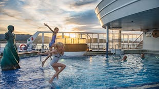 Utsiktsloungen øverst har en enestående utsikt, med store panoramavinduer og komfortable sittegrupper.