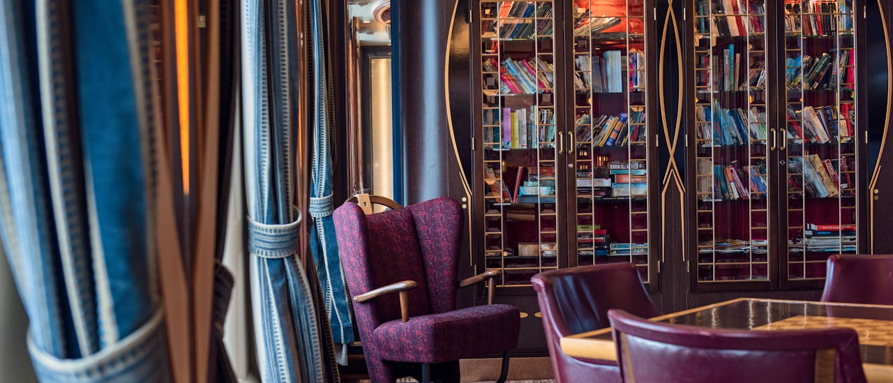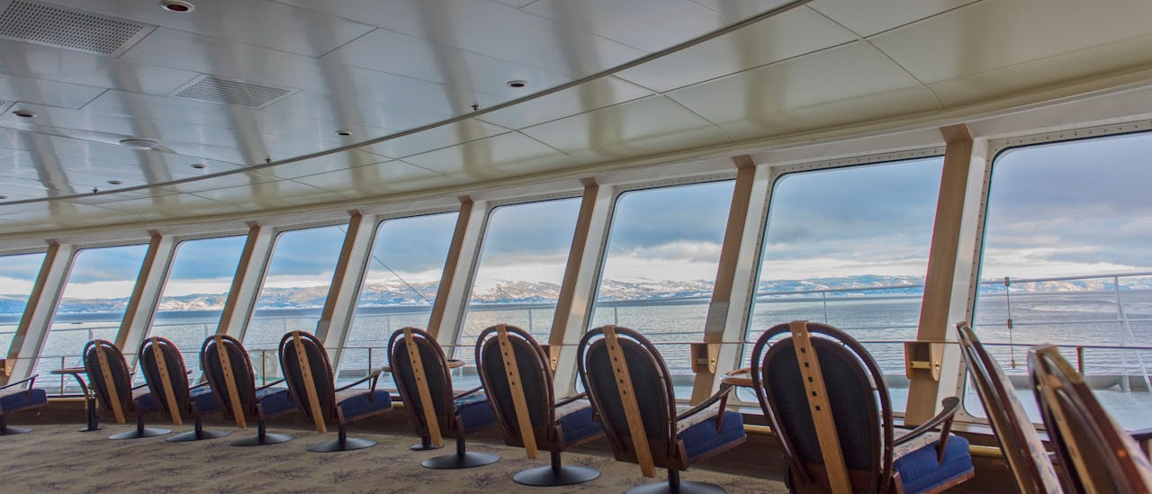 Utsiktsloungen øverst har en enestående utsikt, med store panoramavinduer og komfortable sittegrupper.