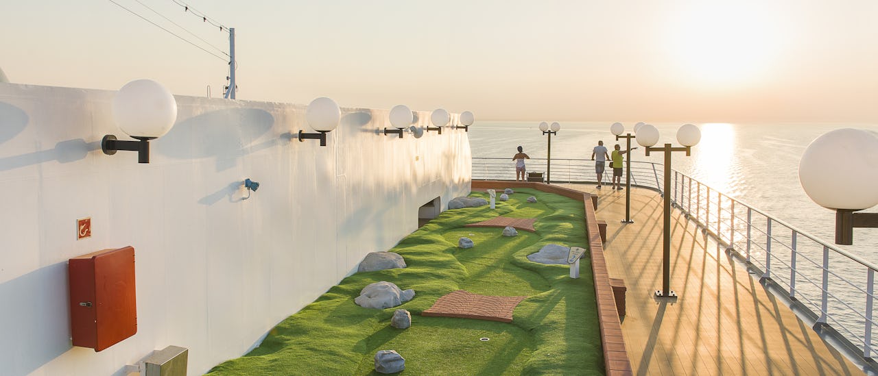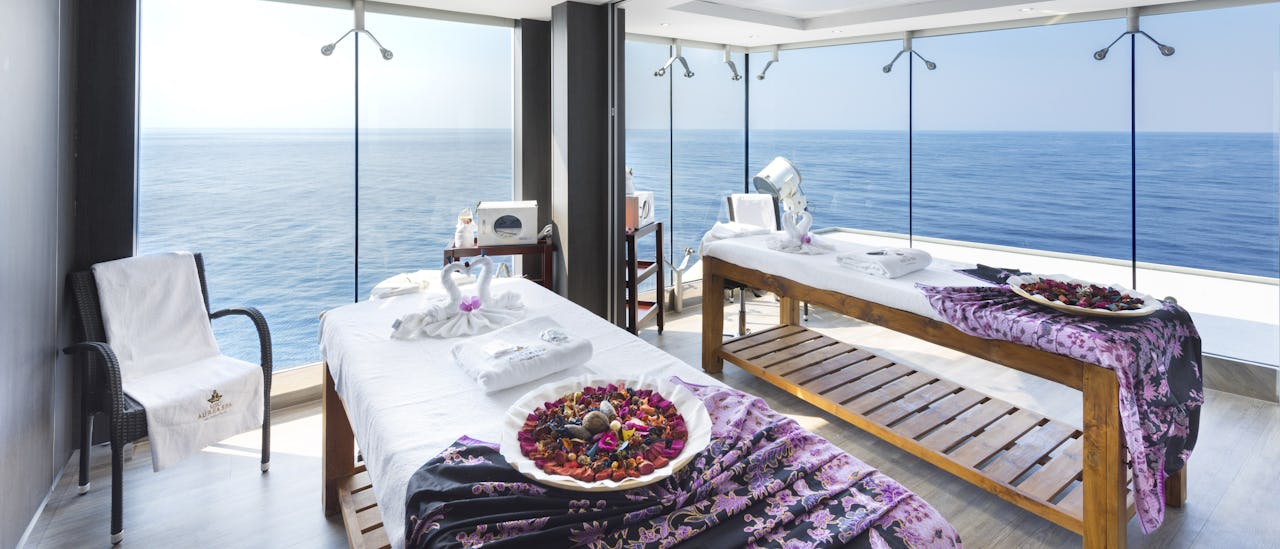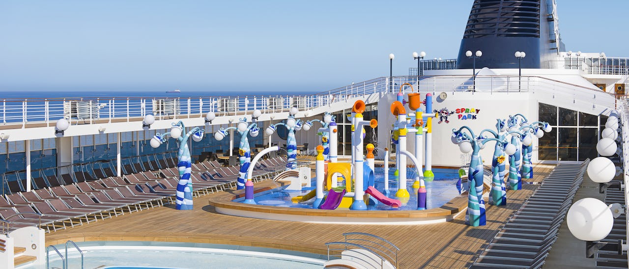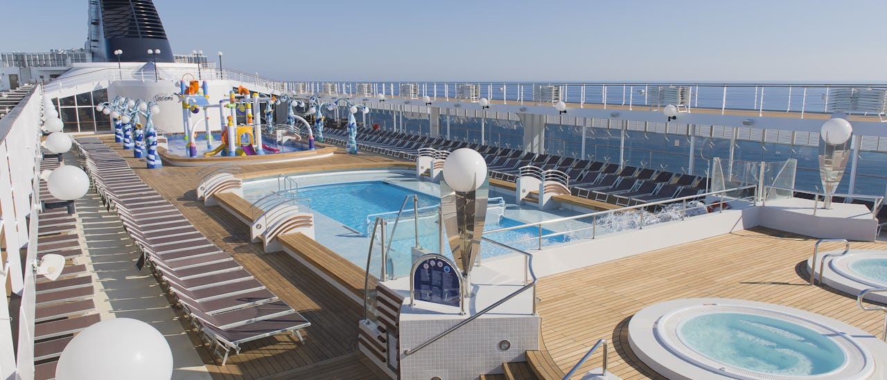 På øverste dekk finnes det flere flotte bassenger og jacuzzier, treningsstudio og spaavdelingen.
