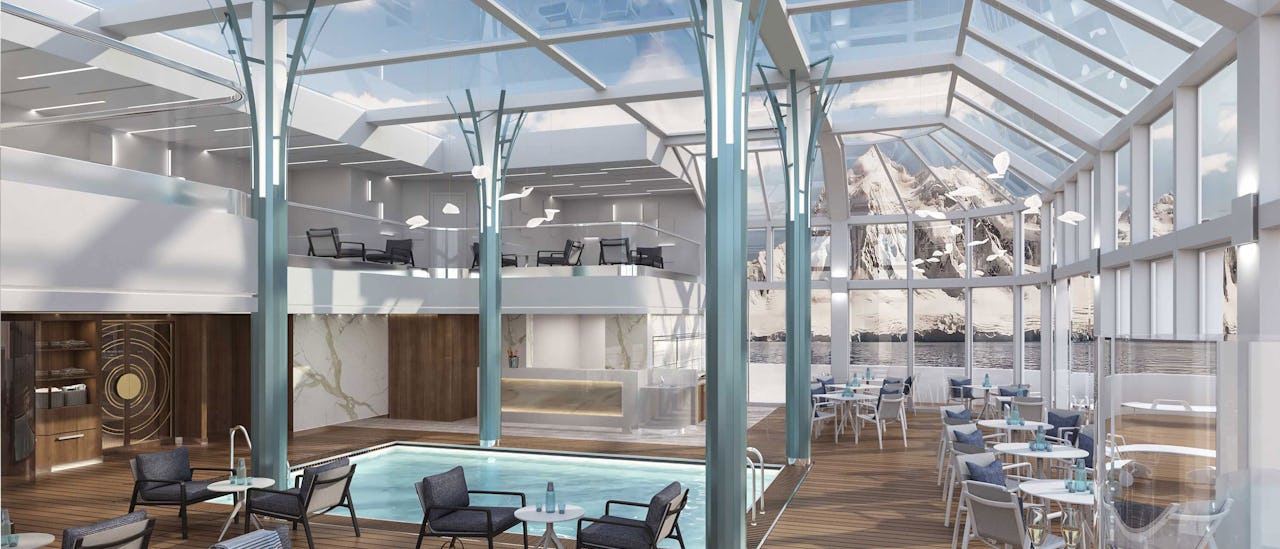 Toppdekkets solarium har et basseng og boblebad med et spa rett ved siden av.